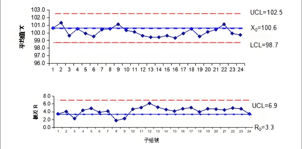 基于正态分布特性:若过程稳定,99.73%的数据应落在中心线±3σ​(标准差)的控制限内。